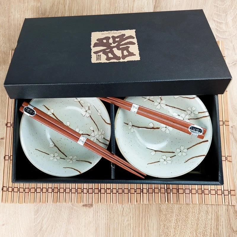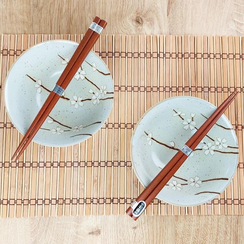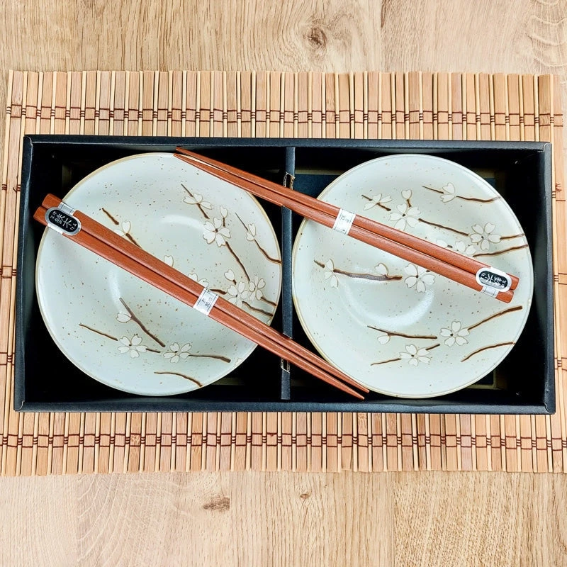 Set of two Japanese bowls with cherry blossom design and wooden chopsticks