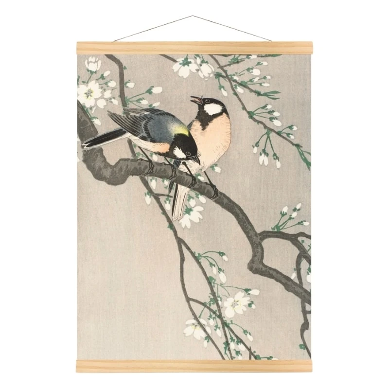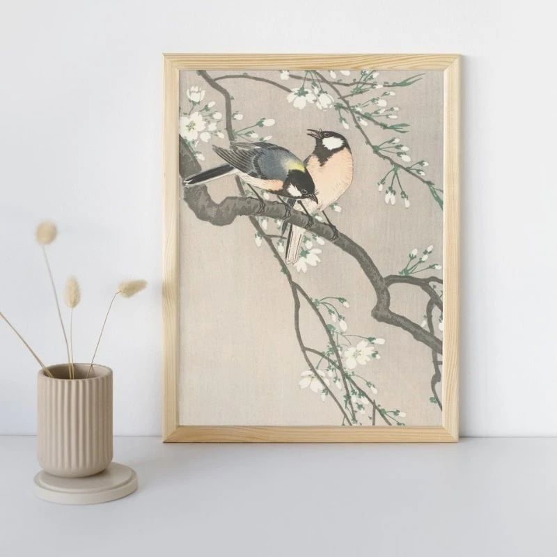 A nice japanese art print representing a couple of chickadees on a cherry blossom tree branch. The chickadee symbolizes the arrival of beautiful things, as well as love, faith and loyalty. The cherry blossoms remind us of the transience and beauty of life. This painting is loaded with symbols and delivers the message that we should continue to cherish each moment, cultivate our relationships and find beauty in the simple things in life.