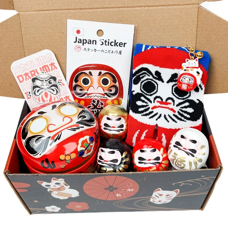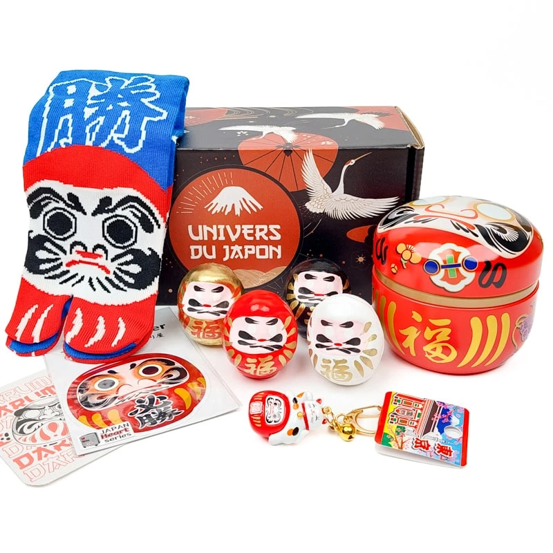 The box contains four small papier-mâché Daruma to use for achieving your goals, a metal tea box, a pair of tabi socks, a keychain and a sticker to personalize your belongings.