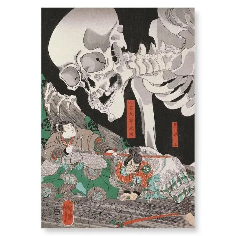 In Japanese folklore, the gashadokuro is a spirit taking the form of a giant skeleton. This yōkai wanders the countryside at night, looking for lonely travelers to rip off their heads and drink their blood. This gashadokuro comes from the triptych of artwork prints by Utagawa Kuniyoshi, Takiyasha the witch and the skeleton ghost, dating from 1844 and featuring a princess invoking this yōkai in order to protect the palace from her enemies.