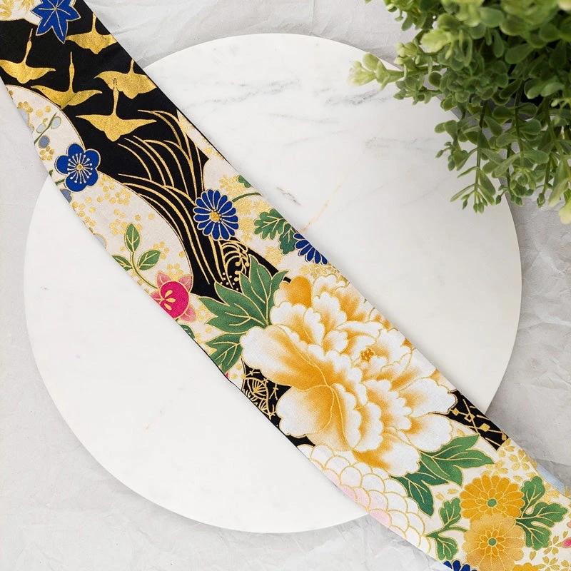 With its floral pattern and golden touches, this women’s obi belt is just sublime. The sumptuous fabric is a testament to the rich culture of Japan. It features cherry blossoms, peonies, and chrysanthemums.
