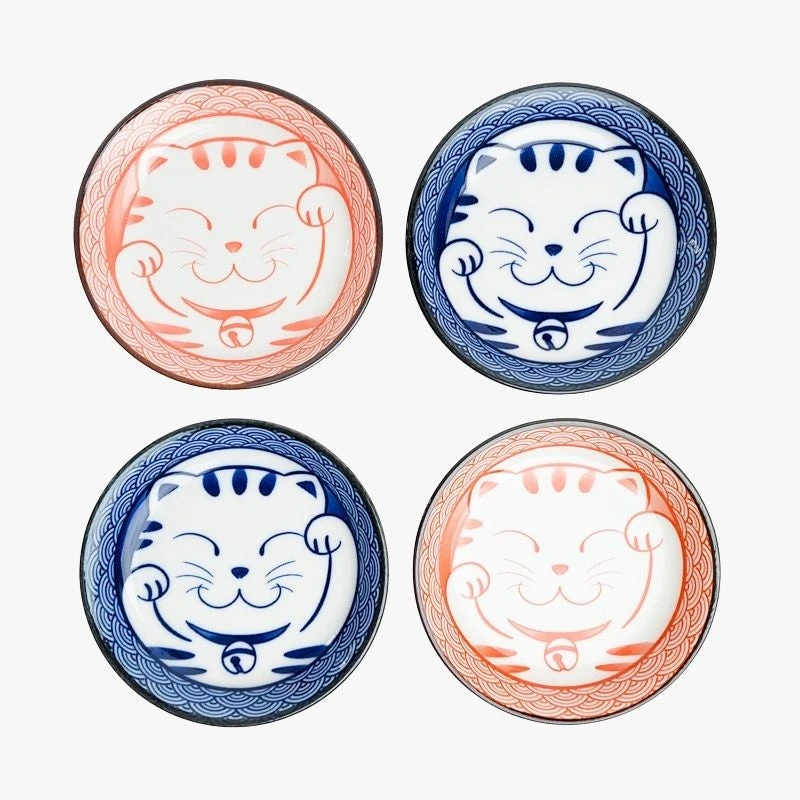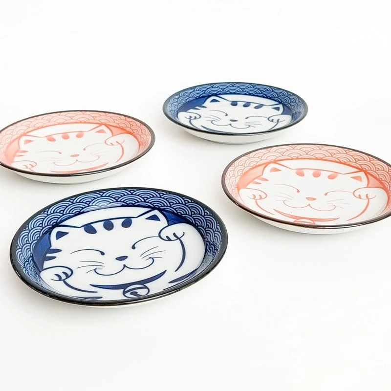 Boxed Set of Four Small Plates with Japanese Cat Motif