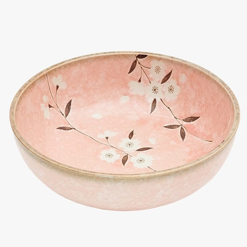 This lovely Japanese ceramic bowl, in soft pink tones, features delicately drawn sakura flowers. Its wide, shallow shape makes it perfect for serving fresh salads or hot dishes, adding a touch of elegance to your table. Made in Japan, this bowl can be used as an individual soup plate or as a serving dish.
