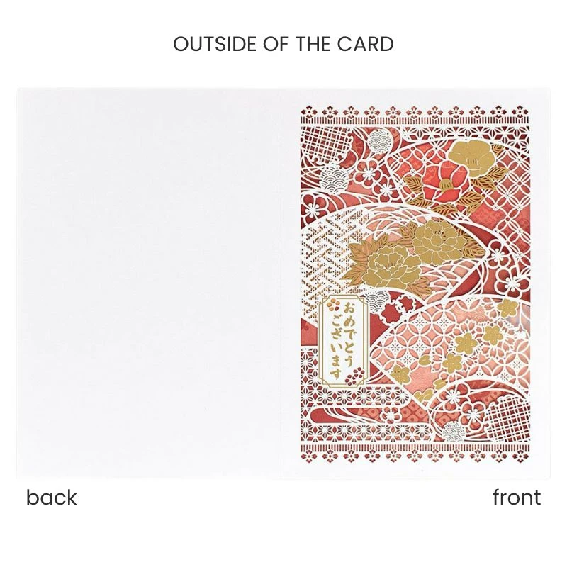 Celebrate special moments with this beautiful openwork paper card, laser-cut and embellished with gold leaf markings. Delicate floral motifs and traditional Japanese fans create a refined, sophisticated design. The Japanese message “おめでとうございます” (Congratulations) adds a warm, authentic touch. Perfect for expressing your heartfelt wishes, this card combines traditional Japanese craftsmanship with elegant aesthetics to make every occasion memorable.