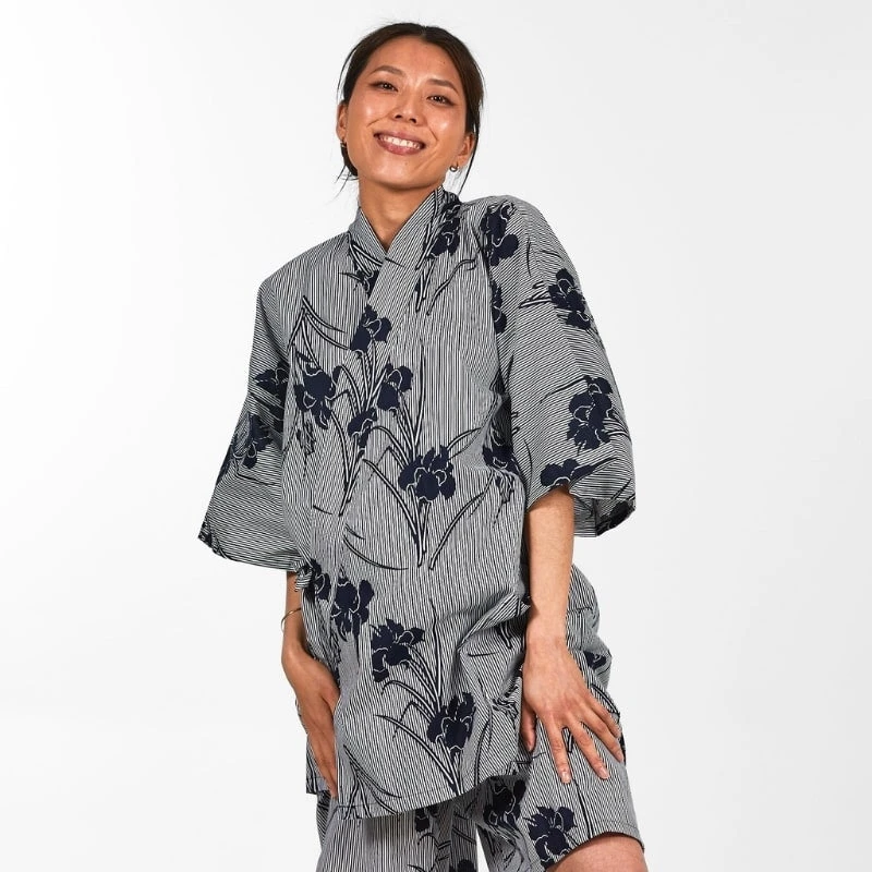 This beautiful cotton jinbei offers a perfect combination of freshness and elegance, featuring subtle stripes and a navy blue iris flower pattern. Ideal for warm summer days or relaxing at home, it’s lightweight and comfortable. The tie-front jacket with a front pocket and elastic-waist shorts ensure freedom of movement. Handmade in Kyoto, this jinbei blends Japanese tradition with modern style for an authentic, laid-back look.