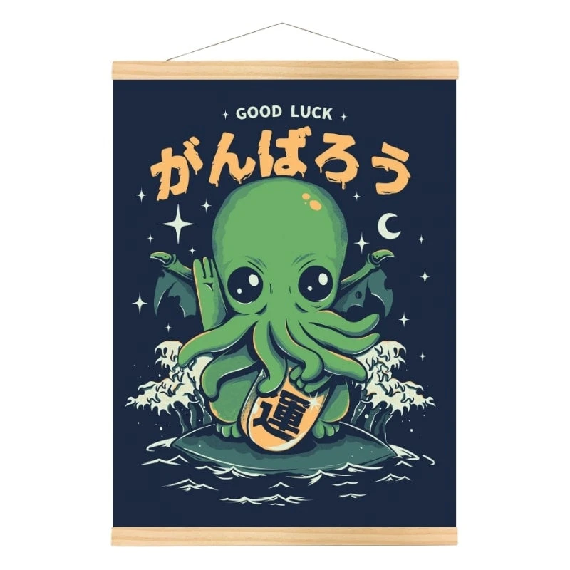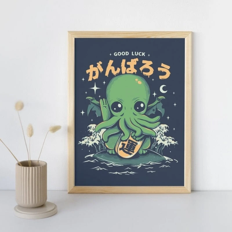 This adorable version of Cthulhu, inspired by the famous Maneki Neko, wishes you good luck with his raised paw and koban coin. The phrase がんばろう (*ganbarō*) means “good luck” or “do your best.” This cute sea monster adds a fun twist to Lovecraft’s mythology, becoming a symbol of fortune. Perfect for those who enjoy quirky humor and geek culture, this Japanese poster will bring an original and positive vibe to your space. Ideal as a gift or for yourself, to bring a touch of luck with style and whimsy!