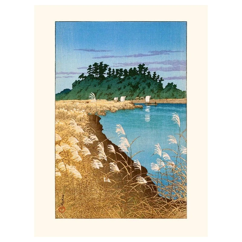 This reproduction of a Japanese print by artist Kawase Hasui captures the essence of late autumn in Ichikawa. It features sailboats gliding across a tranquil lake, framed by a field of golden grasses and a wooded hill in the distance. The ambiance exudes serenity and tranquility, with soothing colors that evoke a sense of peace.