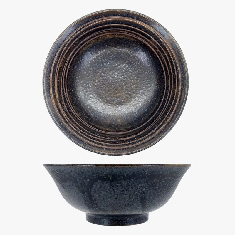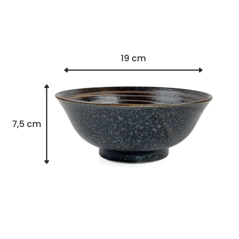 Indulge in the exquisite flavors of Japanese cuisine with sophistication using our stunning black ceramic ramen bowl. Featuring a rich glazed finish and a sleek design adorned with concentric lines, this bowl brings an element of grace to your dining table. More than just a utensil, it is a work of art destined to elevate every dining experience. Perfect for serving ramen, soups, or noodle dishes, this bowl seamlessly blends practicality with aesthetic appeal. Enhance your table setting with this captivating ramen bowl that captivates both the eye and the palate!