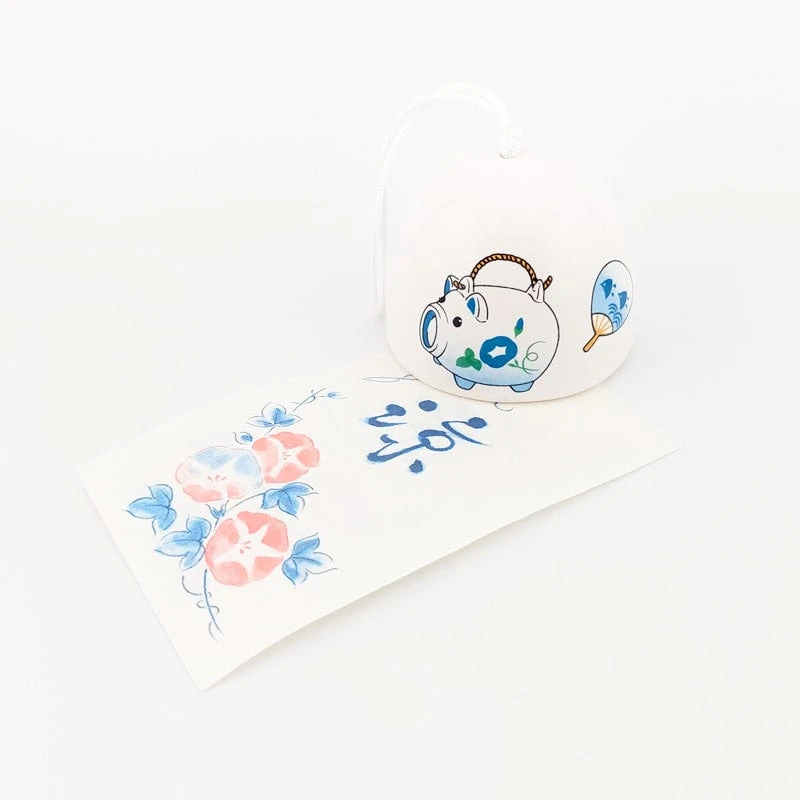 Celebrate summer with this charming Japanese wind chime. It produces a soft, soothing tinkle when the hanging paper moves with the breeze. The ceramic bell features two symbols of summer in Japan: the uchiwa fan and the katori buta, a small pig used for burning mosquito repellent incense.