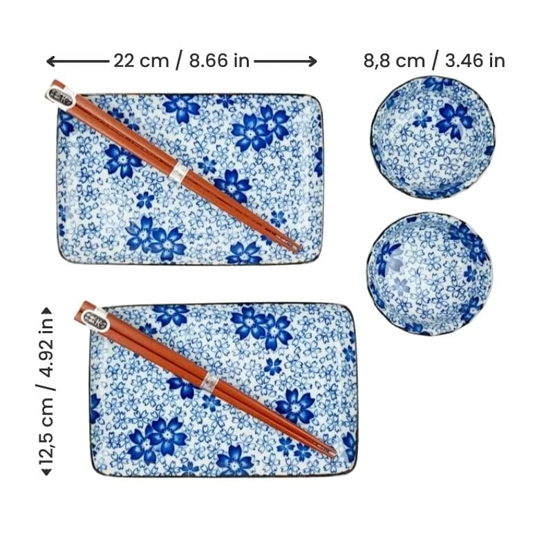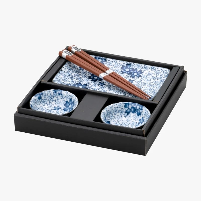 Japanese sushi set with cherry blossom design in blue and white