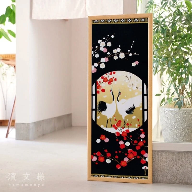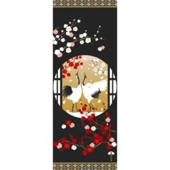 Two cranes dance gracefully within a golden circle, surrounded by delicate plum blossom branches—symbols of longevity and renewal in Japanese tradition. This refined Japanese towel is dyed using artisanal techniques that highlight its rich design and quality texture. Whether gifted or displayed, this tenugui is a stunning piece of textile art.