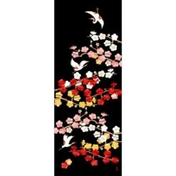 This refined Japanese towel captures the grace of cranes in flight through blossoming plum branches. Set against a deep black background, red, white, and gold ume flowers bring a touch of brightness and sophistication. Made in Japan from 100% cotton and hand-dyed using traditional techniques, this tenugui is as suitable for display as it is for everyday use.