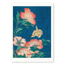In this stunning Japanese woodblock print reproduction titled “Peonies and Canary” (1834), Katsushika Hokusai captures a moment of natural beauty with vibrant peonies and a canary in flight. The striking contrast between the red flowers and the deep blue background highlights the delicate floral details and the graceful movement of the bird. Hokusai, renowned for his depictions of nature, masterfully creates a scene that is both dynamic and harmonious.