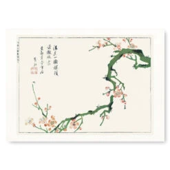 This minimalist piece by Ôoka Shunboku, titled Sorimachi 409, captures the delicate and simple beauty of Japanese nature. The sinuous branch, adorned with barely-opened plum blossoms (ume), evokes a poetic moment when life quietly reawakens in the heart of spring. The contrast between the soft hues of the flowers and the white background reflects the purity and serenity of traditional Japanese aesthetics. This elegant reproduction will add a touch of grace and lightness to your home.