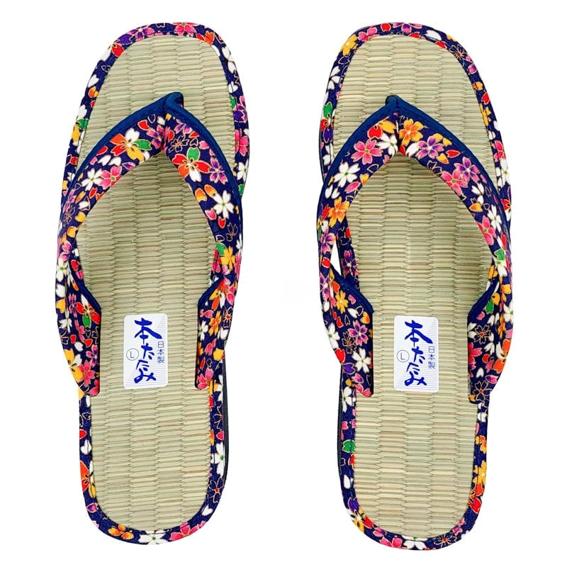 These elegant Japanese zoris for women are handcrafted by artisans in Japan. With a genuine tatami rush sole, they feel cool and comfortable, even in hot weather. The rubber coating under the sole makes them perfect for both indoor and outdoor use. The fabric straps, adorned with sakura motifs, add a touch of charm and femininity to every step.