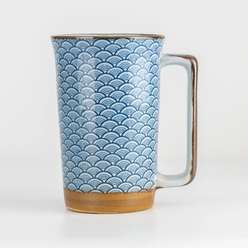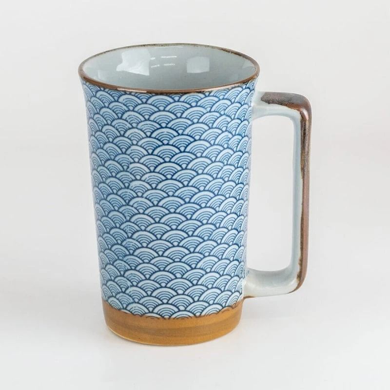 The seigaiha motif embodies the serene waves of the sea, symbolizing the tranquil strength and innate power of nature. This traditional motif beautifully enhances the design of this large Japanese mug with a handle. Standing tall and proud, this mug is designed to accommodate ample quantities of your favorite beverage. Perfect for tackling difficult mornings or enjoying cozy winter evenings.