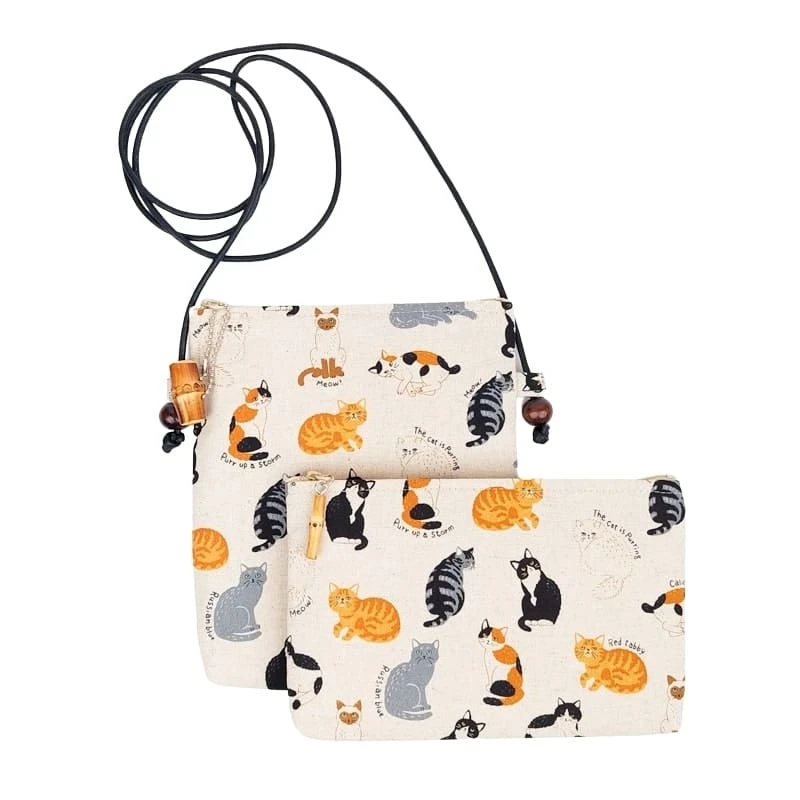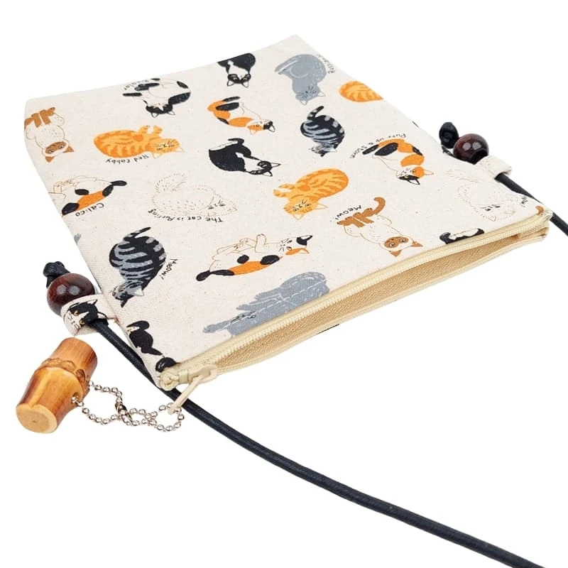 This adorable Japanese shoulder bag features a playful cat motif on a soft cotton-linen fabric. Its compact size and bamboo-bead zipper make it ideal for carrying your essentials lightly. Wear it crossbody or over the shoulder thanks to the adjustable knotted strap. A perfect blend of cuteness and craftsmanship!