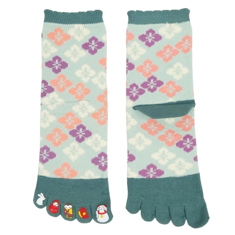 These Toe Socks are decorated with traditional Hanabishi flowers and lucky symbols on each toe — from maneki-neko to daruma and owls. They ventilate your feet, improve posture, and spread joy with every step.