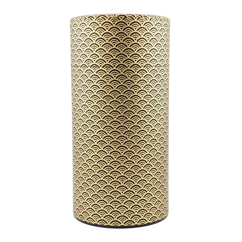 Embellished with the Seigaiha motif, representing stylized waves, this Japanese washi tea canister symbolizes peace and good fortune. The golden wave pattern on a black background gives it a traditional yet refined style. Crafted from high-quality washi paper, renowned for its strength and unique texture, it’s ideal for storing tea, coffee, or sugar while maintaining their freshness. A perfect gift for admirers of Japanese culture and timeless design.