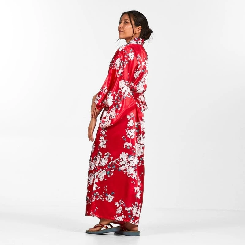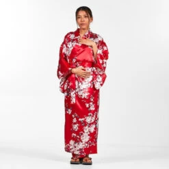 The Cherry Blossom Women’s Japanese Kimono showcases the timeless beauty of sakura flowers, symbolizing renewal and elegance. Crafted from polyester satin, it features a soft, silky texture and a striking red background that enhances its vibrant charm. Made in Kyoto, this kimono adds a touch of Japanese sophistication to your relaxation moments. With its matching belt, it gracefully highlights the figure, embodying femininity and poise.