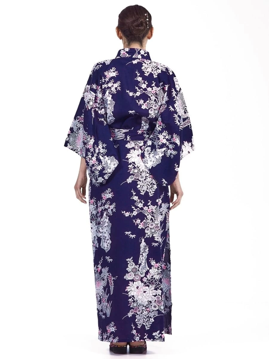 Women’s Japanese Yukata Kimono with Peony & Geisha Motif
